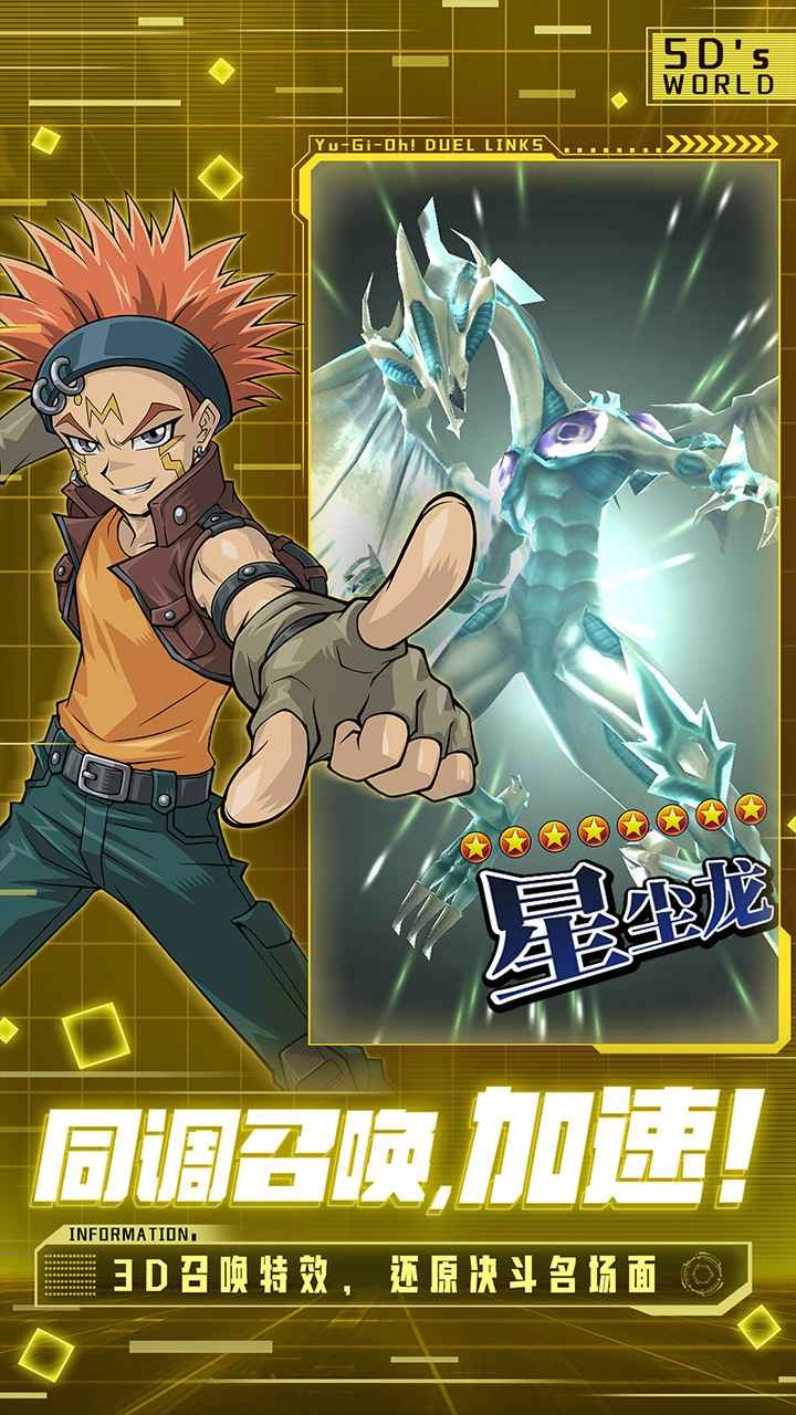 为了庆祝5D's世界的开启,登录将可以领取到梦想卡兑换券、1000宝石、限定镜碎卡片奖励、纪念卡套卡垫、技能兑换券。